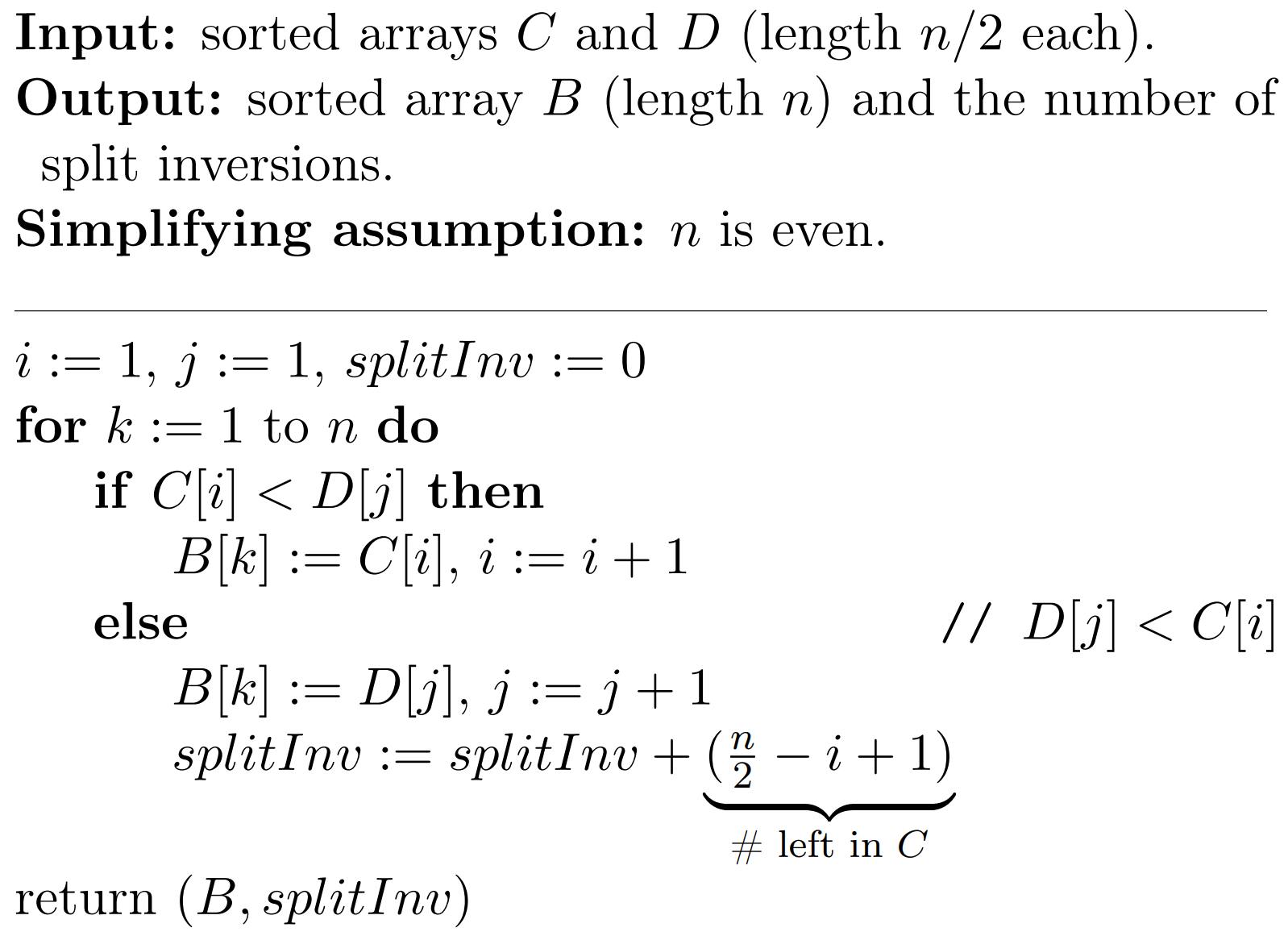 - **Output:** The number of inversions of $A$ — the number of pairs $(i, j)$ of array indices with $i < j$ and $A[i] > A[j]$.